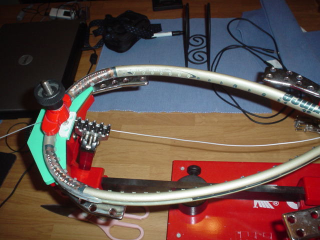 Then tension the other main string on the other half of the racquet. Clamp it by moving the clamp from the throat to the head as shown above, i.e the
