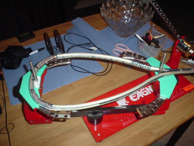 Then tension the other main string on the other half of the racquet. Clamp it by moving the clamp from the throat to the head as shown above, i.e the